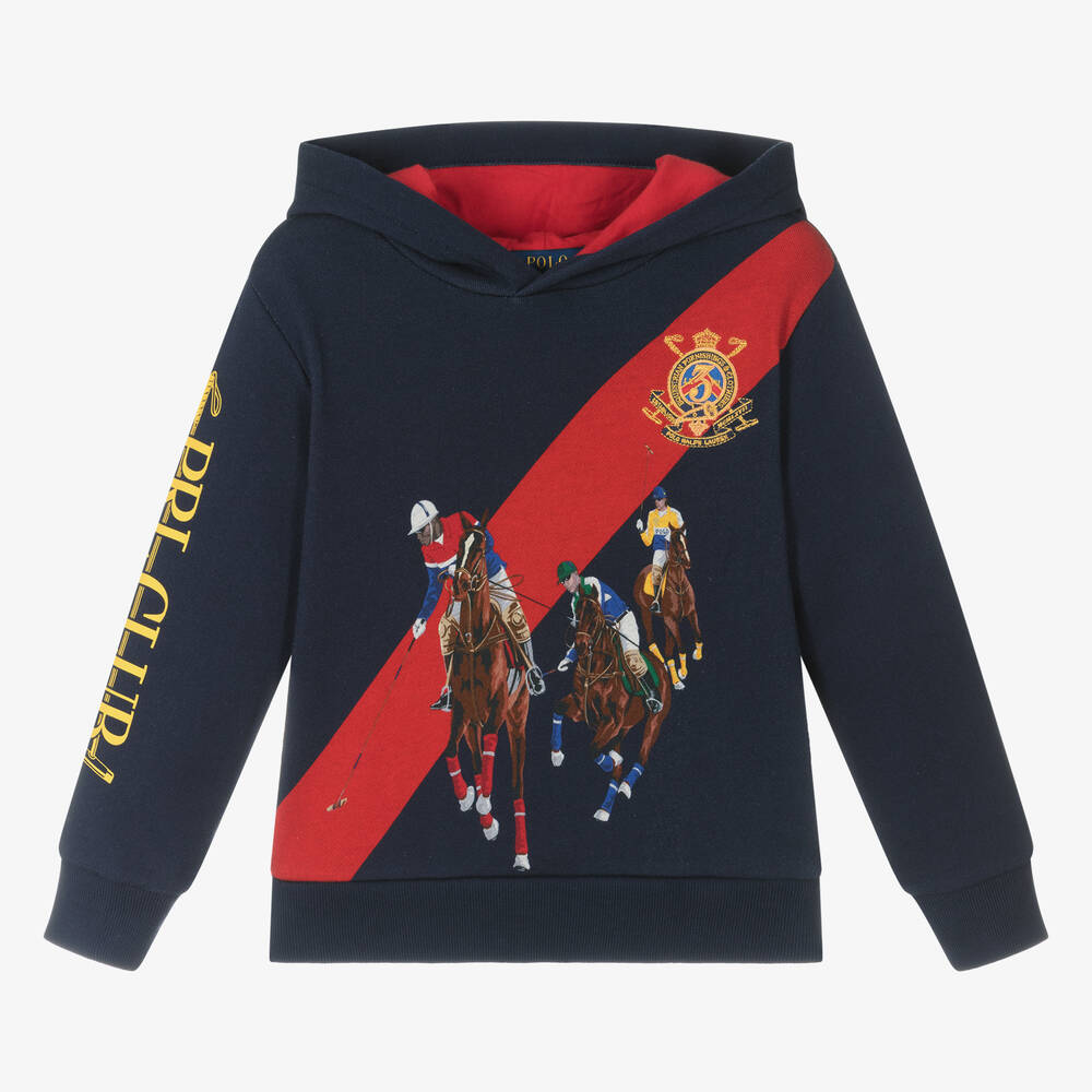 Casual and comfortable for boys, this navy blue hoodie is by Ralph Lauren. Made in mid-weight cotton-blend jersey, it has ribbed trims and a cosy fleecy inside, with concealed side seam pockets. A colourful equestrian print is featured on the front, with an embroidered crest on the chest, and a 'PRL Club' logo print on one sleeve.