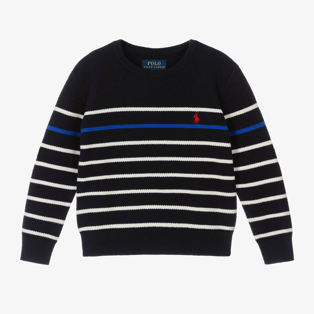 Navy blue cotton jumper for boys by Ralph Lauren, with white stripes for a classic, preppy look. Soft and lightweight, this long-sleeved top is knitted with a fine piqué style pattern and has gentle ribbing on the crew neck, cuffs and hem. For a stylish finish, there is a contrasting bright blue stripe around the middle and the American brand's signature pony logo is embroidered on the chest in red.