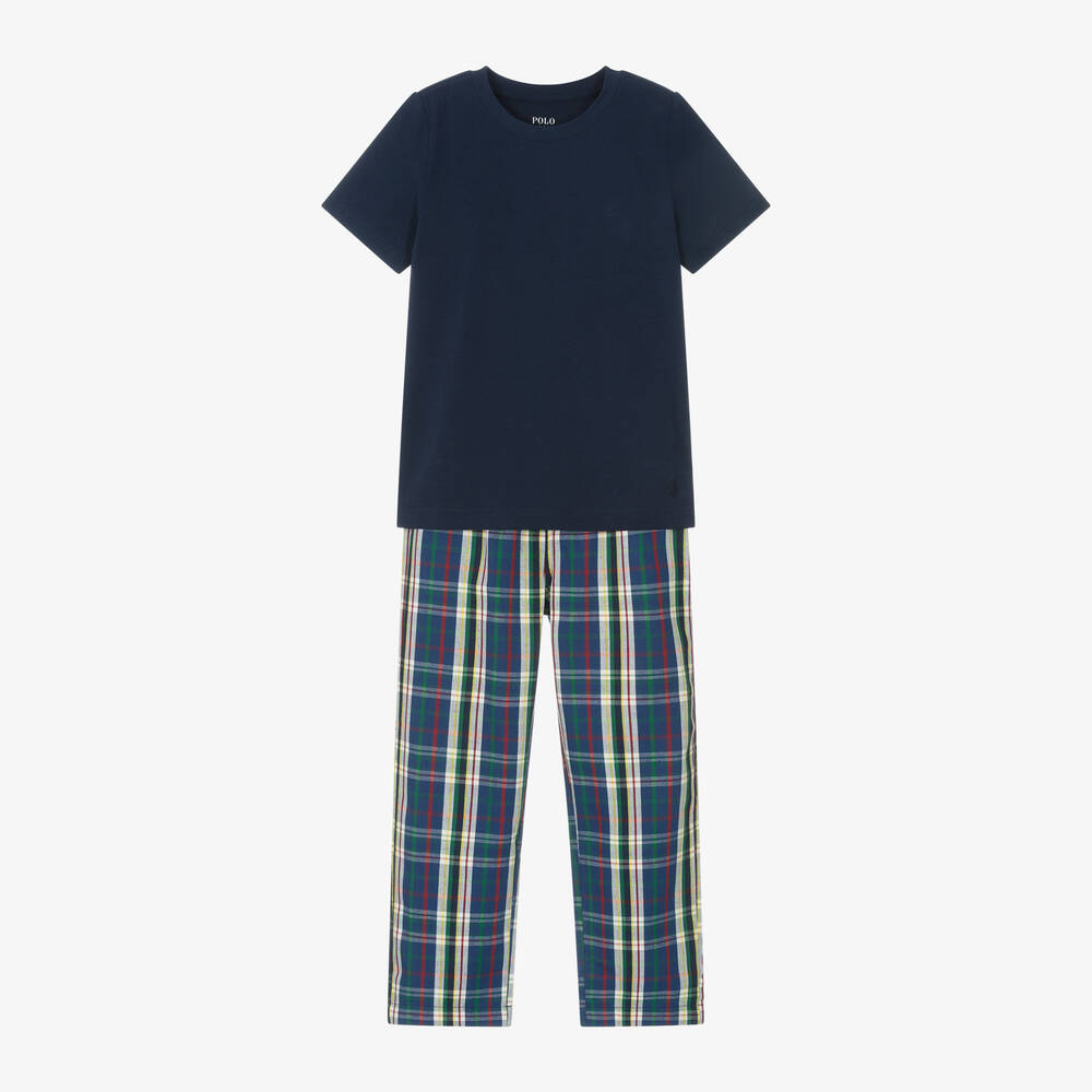 Navy blue tartan pyjamas for boys by American brand Ralph Lauren, made in soft cotton. The super soft, stretchy jersey T-shirt has a brushed feel and the designer's signature pony logo embroidered by the hemline. The lightweight twill tartan trousers have a coordinating logo on one side and a comfortable, elasticated waistband. Just right for a good night's sleep, these pyjamas are ideal for relaxing in too.