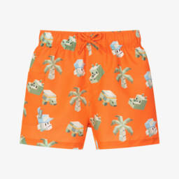 Neon orange swim shorts for boys by Polo Ralph Lauren, made in recycled fabric. Lined in soft mesh, these stand-out swim shorts have a comfortable drawstring waist and a cool Polo Bear logo appliqué on one leg. The back pocket has a button fastening and a holiday-inspired logo badge for a fun finishing touch.