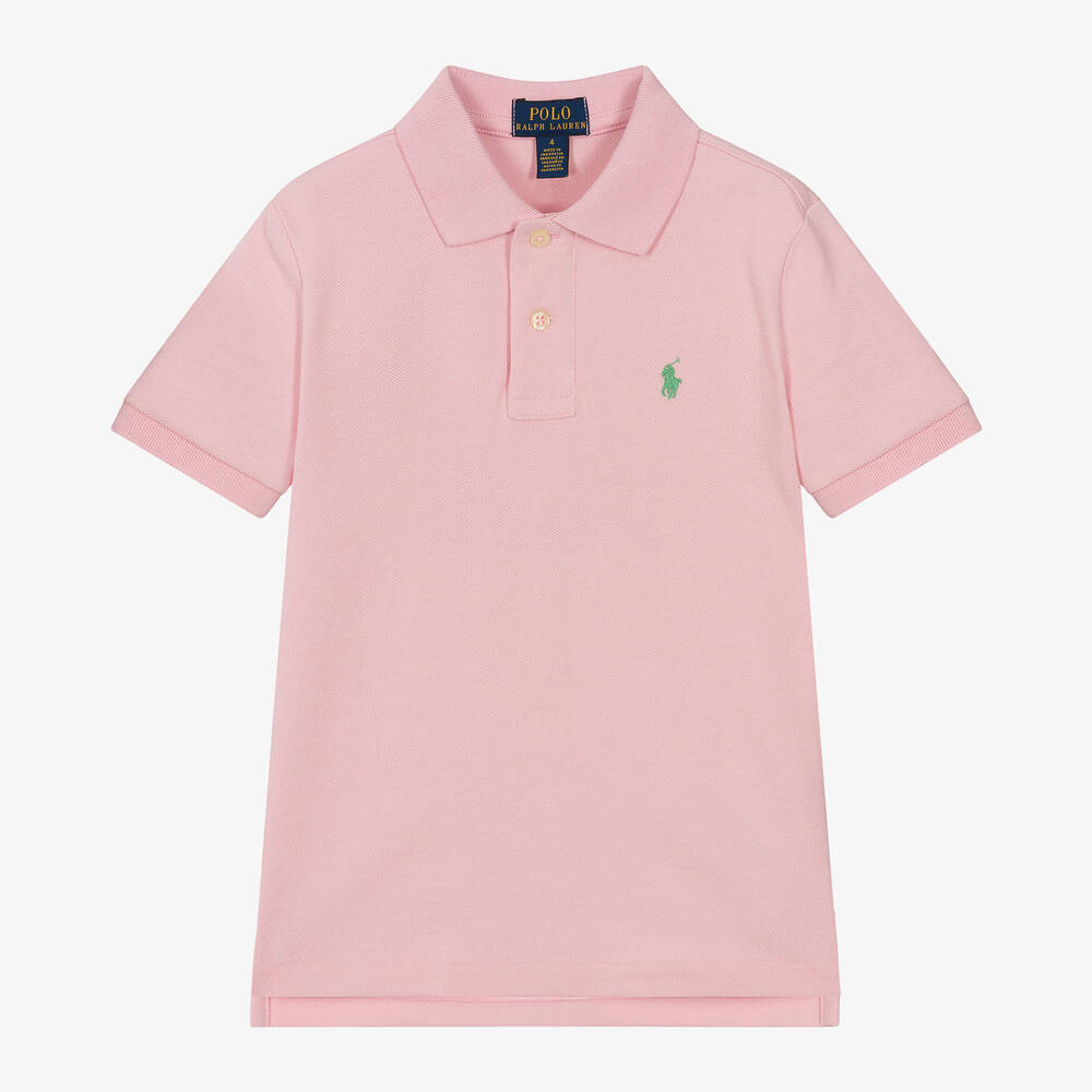 Preppy pink polo shirt for boys by American designer, Ralph Lauren. In true polo style, this cotton, short-sleeved top has a pointed collar, ribbed cuffs and a button placket on the front. The brand's unmistakeable pony logo can be seen embroidered on the chest in a contrasting green shade.