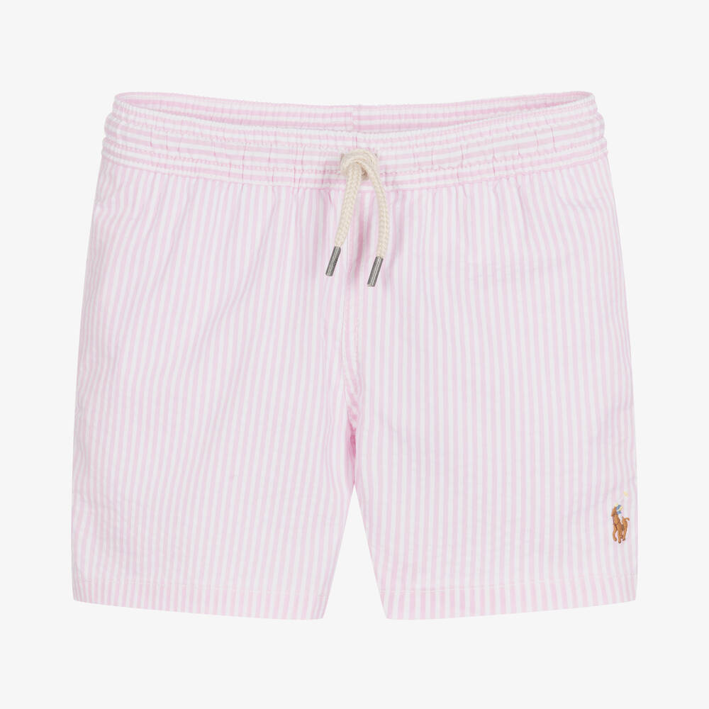 Classic pink and white striped seersucker swim shorts for boys by Ralph Lauren, with the signature Pony logo embroidered on the front. They are made in a lightweight and stretchy cotton blend with comfortable mesh lining and an elasticated drawstring waistband. There are pockets on the side seams and a button-fastening pocket with a logo tab on the back.