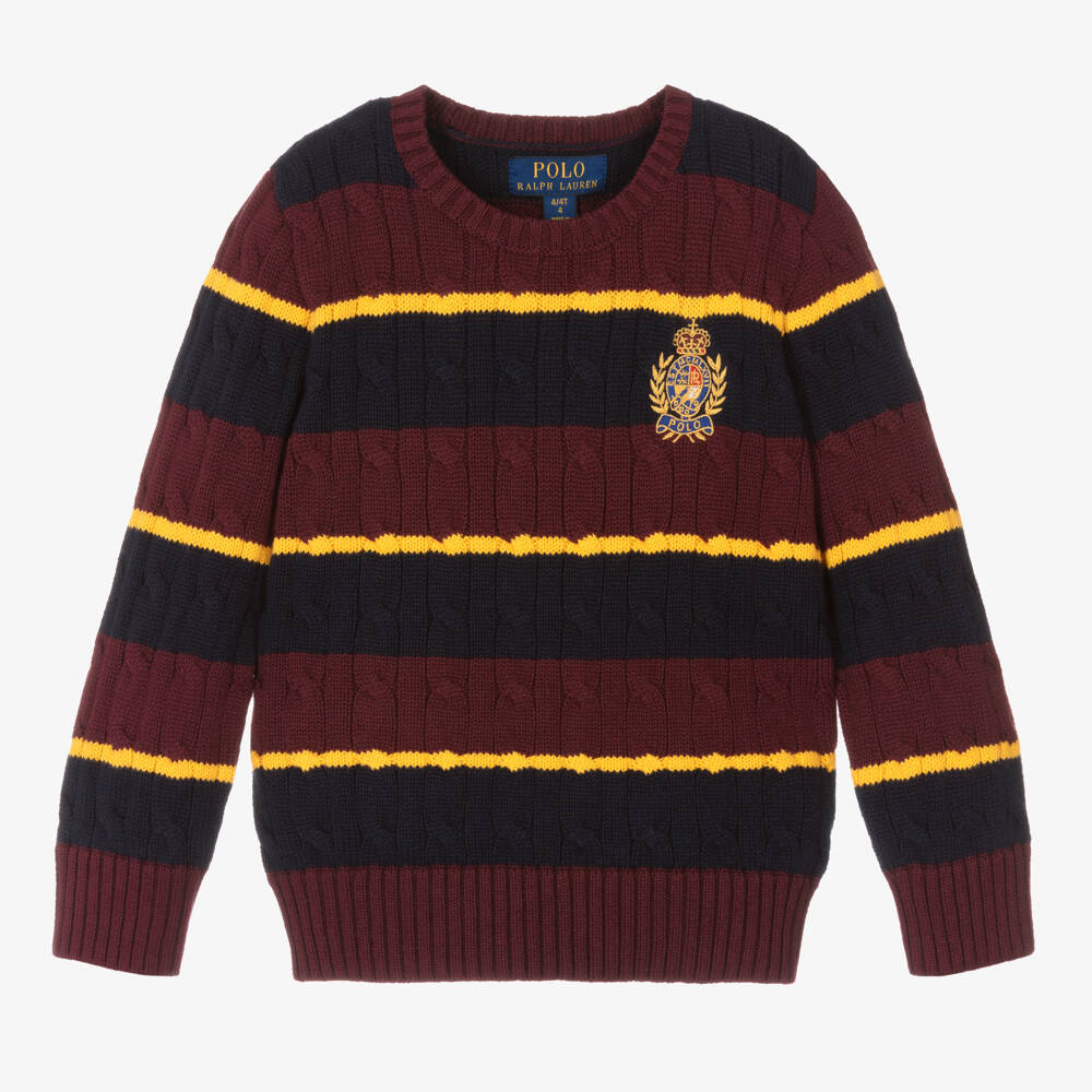 A burgundy red, navy blue and yellow sweater for boys by Ralph Lauren. With jacquard stripes for that signature look, this cosy jumper is made in a beautifully soft cotton knit, with a preppy cable pattern. Adding designer appeal is the golden yellow crest logo motif embroidery on the chest.