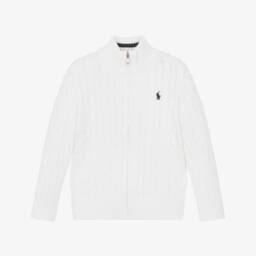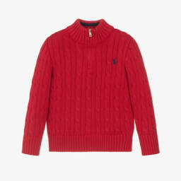 Stylish red sweater for boys by Ralph Lauren, made in soft cotton with a classic cable knit pattern. Warm and comfortable, it features a quarter-zip fastening, ribbed trims and a stand-up collar. For instant designer appeal, the brand's signature Pony logo is embroidered in blue on the chest.