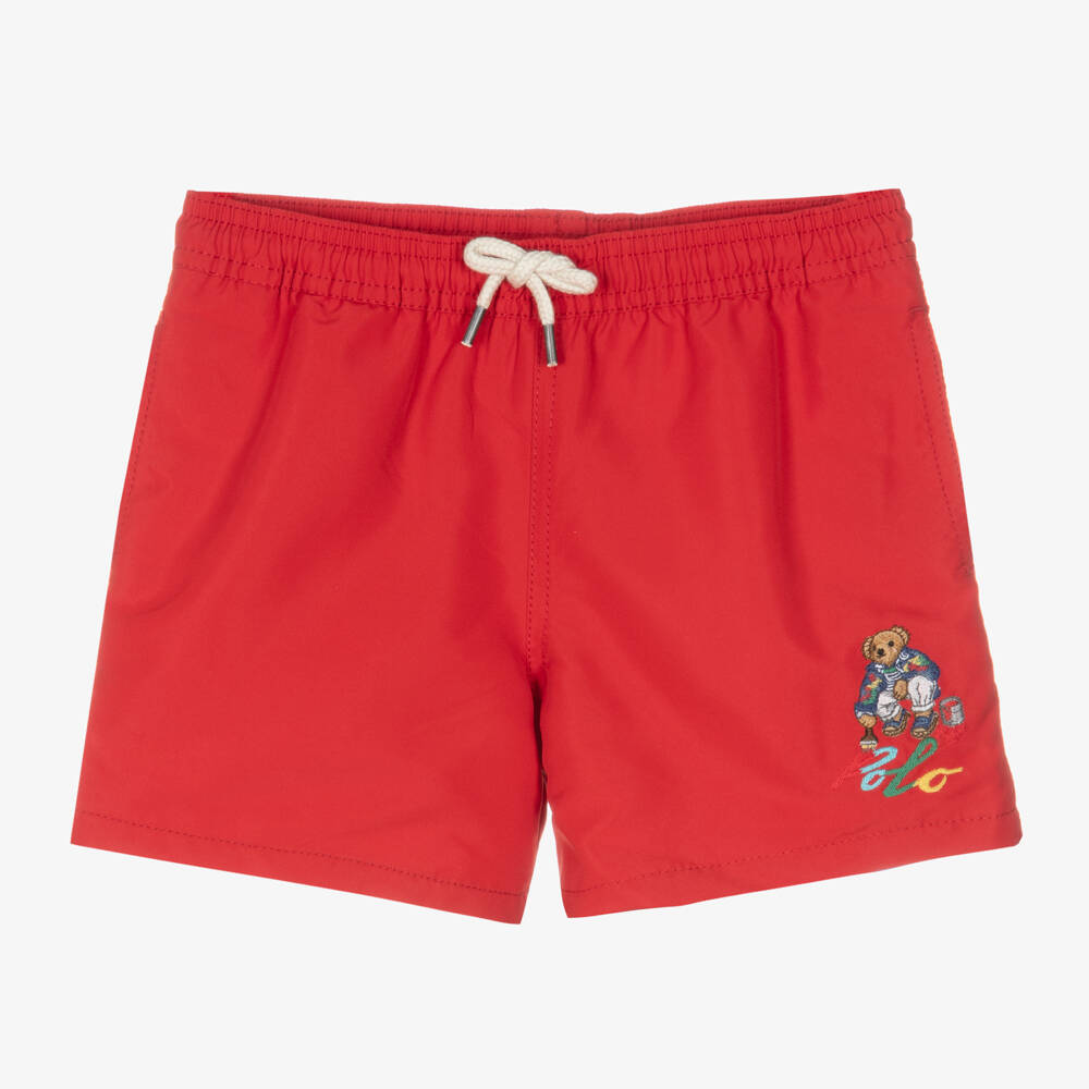 Red swim shorts for boys by Ralph Lauren, made in soft, smooth recycled fabric, with a lightweight mesh lining for comfort. There are side seam pockets and a buttoned pocket on the back. The waistband is elasticated with a useful drawstring fastening on the front. The brand's iconic Polo Bear is embroidered on one leg painting a colourful Polo logo for a fun designer finish.