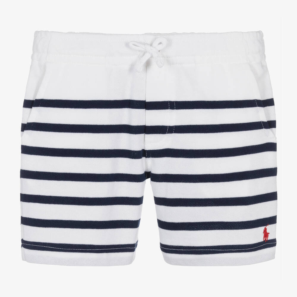 White cotton shorts with navy blue Breton stripes for boys by American brand Ralph Lauren, made in soft, stretchy jersey. Just right for relaxed days, they have a drawstring waistband for a comfortable fit, useful, slanted front pockets and a back pocket. The instantly recognisable, signature pony logo is embroidered on one leg in red.