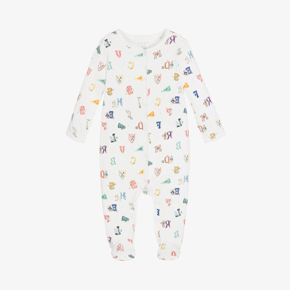 Lovely white babygrow for boys by Ralph Lauren, made in soft and comfortable cotton jersey. Created in collaboration with artist Riley Sheehey, this sweet babysuit is printed with whimsical motifs inspired by classic children's book illustrations. Archival Ralph Lauren motifs can be seen throughout the pattern for a branded touch. Designed for ease, the babysuit fastens with poppers on the front and has protective fold-over scratch mitts.