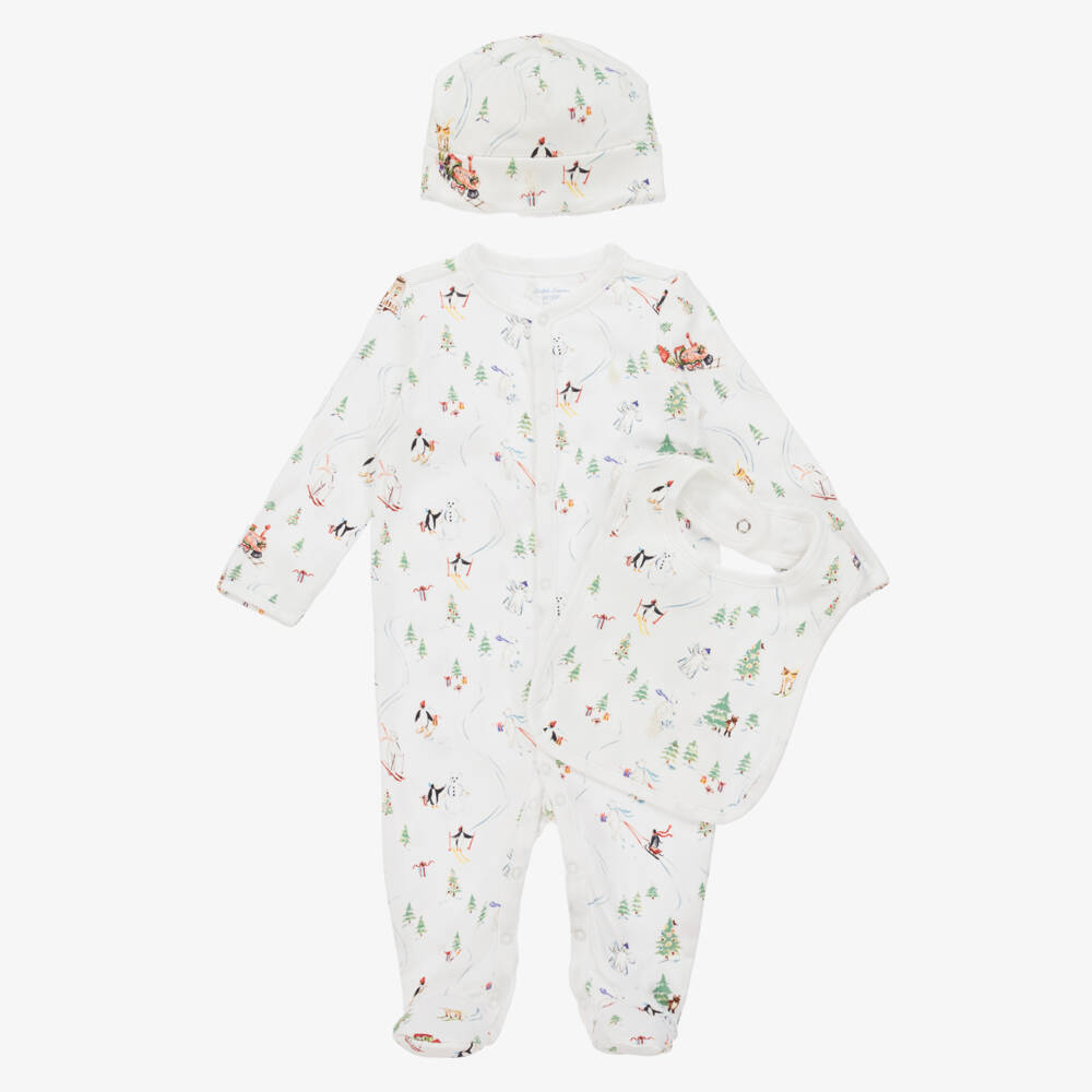 Lovely for the festive season, this white babysuit gift set for boys from Ralph Lauren is patterned with snowy-themed prints and Christmas trees. The set comprises a babygrow, a layette hat and a bib, all made in soft cotton jersey. The babygrow fastens on the front with easy-to-use poppers and the bib secures with a popper at the back. Presented in a branded box, the set makes a beautiful gift for a new arrival.
