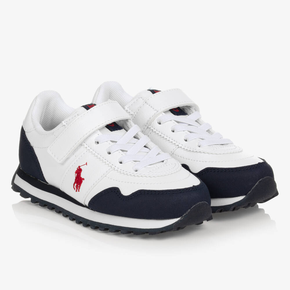 Sporty and casual white trainers for boys by Polo Ralph Lauren, with a single velcro strap and elasticated laces. The uppers comprise a mix of faux leather and shiny canvas panels, with a red signature pony logo on one side. There are navy blue faux suede trims, with red branding on the tongue and heel. They are finished with a textile lining and grippy non-slip rubber sole.