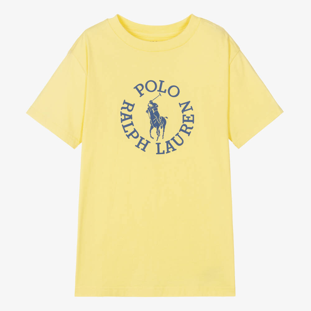A pale yellow cotton T-shirt for boys by Ralph Lauren, in comfortable jersey fabric. In a muted colour ideal for warmer months, this classic tee is stamped with the label's Big Pony branding in dark blue for instant designer recognition.