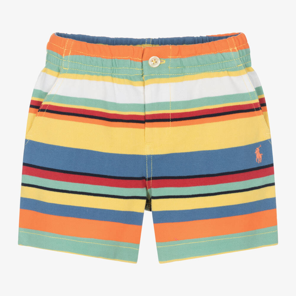 Fun, colourful cotton shorts for boys by American brand Ralph Lauren, striped in yellow, blue and orange. Made in comfortable piqué, they have an internal drawstring for a great fit and fasten on the front with a button and a zip. There are useful, slanted pockets on the sides and a button-fastening pocket around the back. The designer's signature pony logo is embroidered on one side in orange.