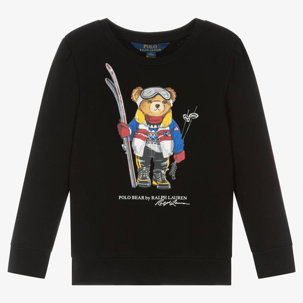 Black cotton blend sweatshirt for girls by Polo Ralph Lauren, with a logo Ski Bear ready for the slopes printed on the front. Ideal for all-day comfort, it is made in stretchy jersey with a warm, fleecy inside and ribbed trims for extra cosiness.