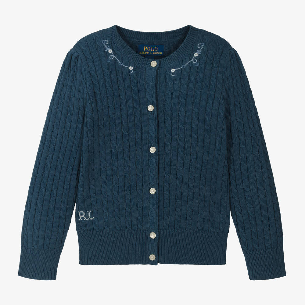 Blue cardigan for girls by Ralph Lauren, knitted in soft cotton. This cable knit layering piece is delicately embroidered with sweet flowers and fastens with classic buttons on the front. The designer's initials are cross-stitched in white near the hem, signing off the look with a touch of branding.