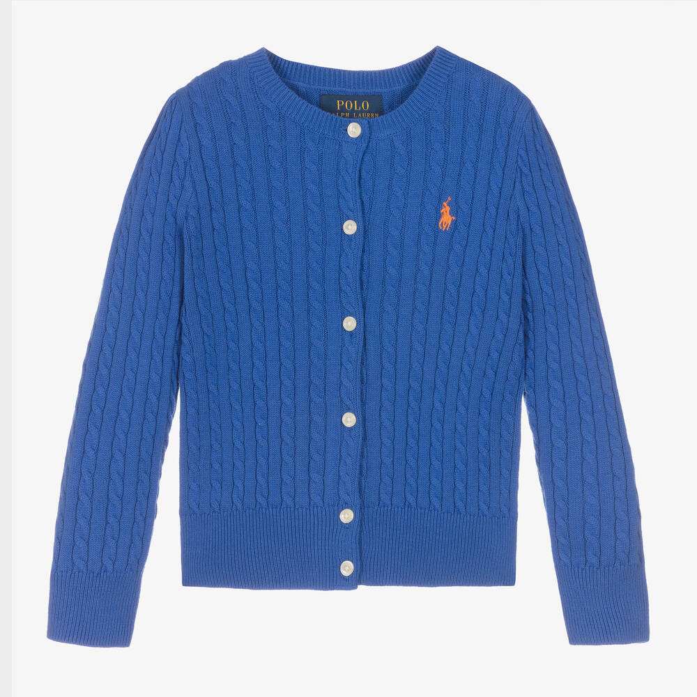 Classic blue cable knit cardigan for girls, by Ralph Lauren. Knitted in soft cotton, it has a signature pony logo embroidered in orange on the chest, and mother-of-pearl button fastenings on the front.