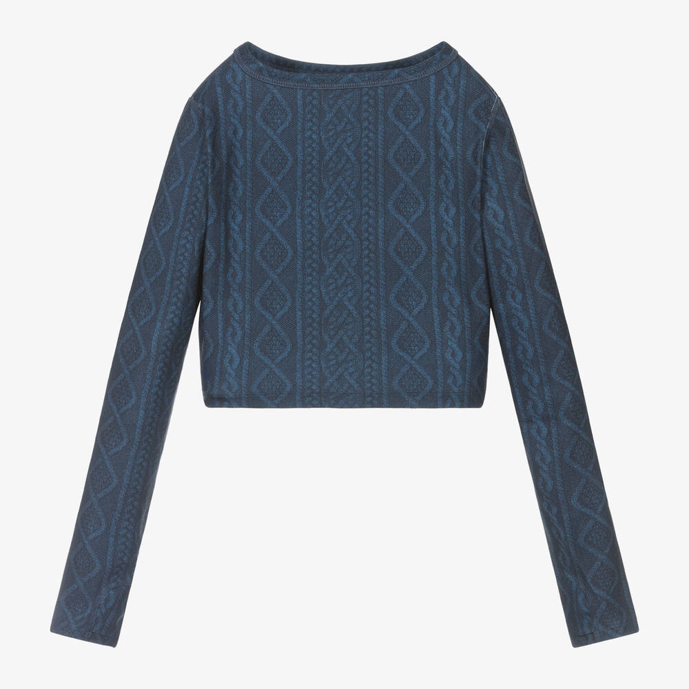Blue sports top for girls by Ralph Lauren, made in stretchy, moisture-wicking jersey. Ideal for both casual and activewear, it is designed in a boxy fit with a cable knit inspired pattern. The long sleeves have useful thumbholes on the cuffs and a tonal pony logo is printed just above the hem.