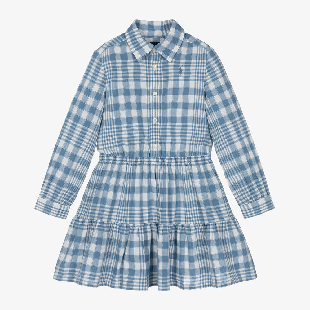In a blue and white check, this lovely shirt dress for girls is by American brand Ralph Lauren. Woven in lightweight cotton, it has long sleeves, a pointed collar, and front button fastenings. The waist is elasticated for comfort and the flared skirt has a frilled hem. Adding a signature finish, the designer's small pony logo is embroidered on the chest in tonal blue.