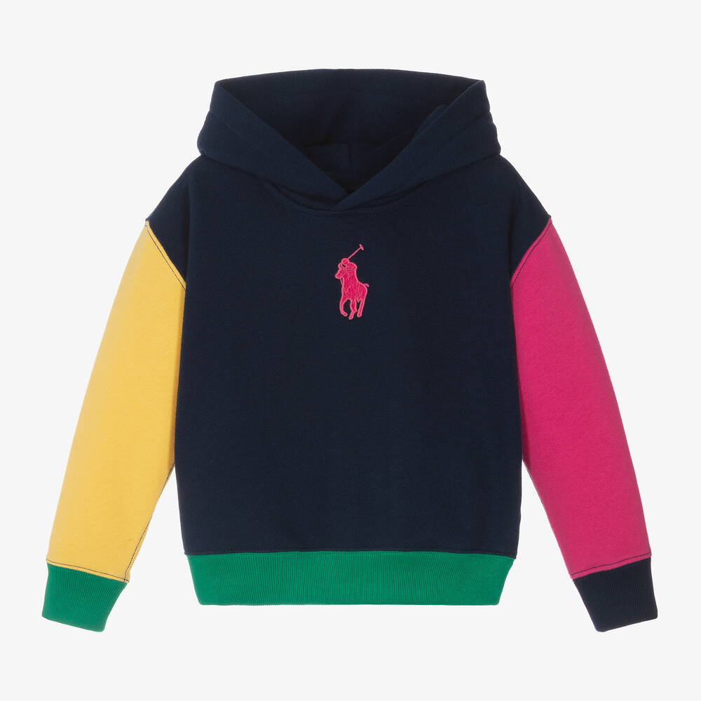Fun navy blue hoodie for girls by Ralph Lauren, colourblocked in pink, yellow and green. Endlessly comfortable, it is made in soft cotton with a fleecy inside, and has the brand's Big Pony logo appliquéd on the front in pink.