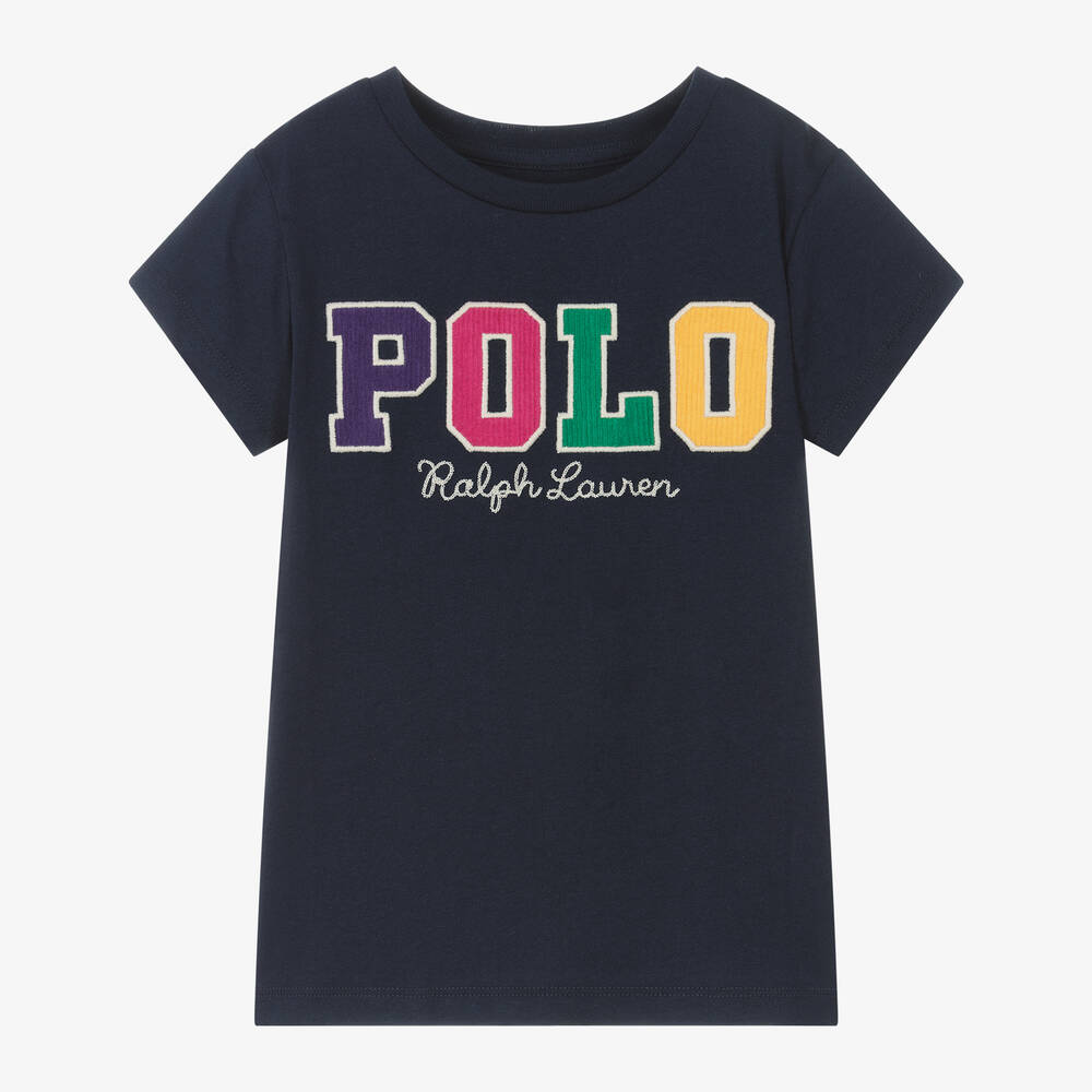 Girls navy blue cotton T-shirt by American brand Ralph Lauren, with a colourful corduroy appliquéd logo on the front, with a white, chain-stitched logo embroidered below. It is made in soft, comfortable jersey with a crew neck.