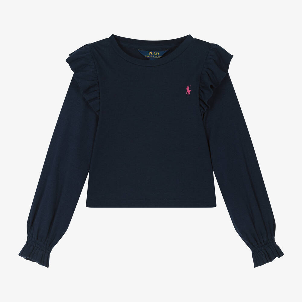Navy blue cotton-blend top for girls by American brand Ralph Lauren, made in soft, comfortable jersey. To elevate the look, there are fun frills over the shoulders and around the gently elasticated cuffs. The label's signature pony logo is embroidered in pink on one side to add a designer finish to this casual piece.