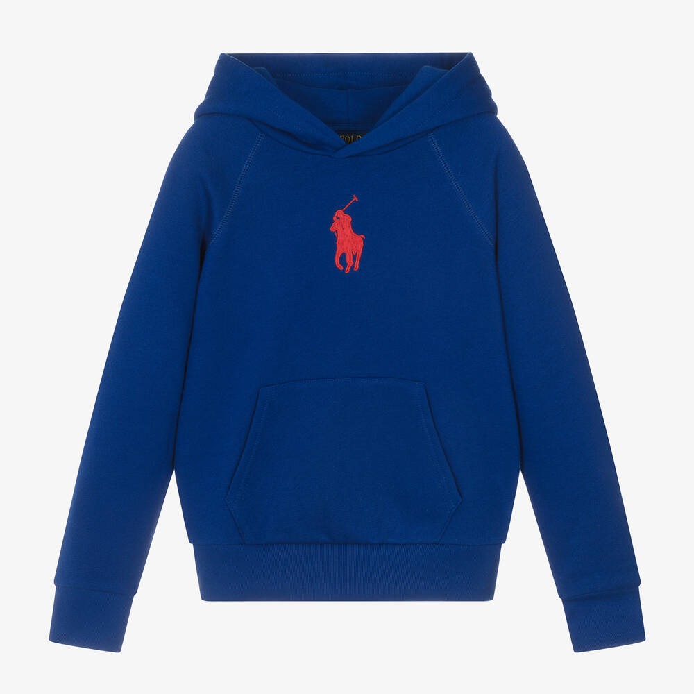 Girls royal blue cotton hoodie by Ralph Lauren. Ideal for casual days, it is made in comfortable jersey with a cosy, fleecy inside and a relaxed fit. On the front is the brand's Big Pony logo embroidered in red, and a useful pouch pocket.