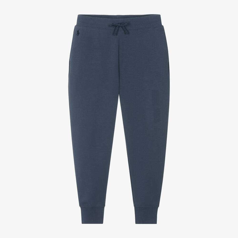 Navy blue cotton jersey joggers for girls by Ralph Lauren. Relaxed and comfortable, they have a drawstring waist for a great fit and useful side seam pockets. The brand's signature pony logo is embroidered in tonal blue on one side.