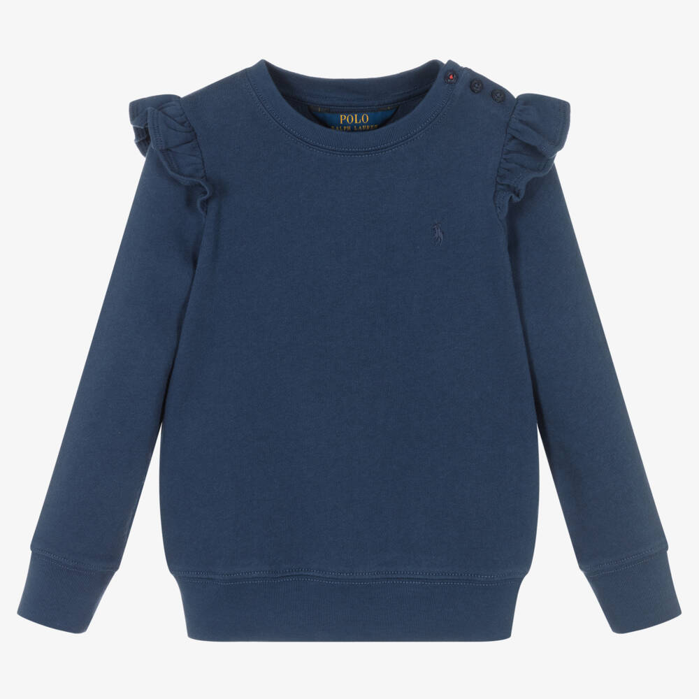 Casual navy blue sweatshirt for girls by American brand Polo Ralph Lauren, made in a lightweight cotton jersey with a looped underside. Sporty yet girly, it has the signature pony logo embroidered on the chest in navy blue, ruffle trimmed sleeves, and button fastenings with embossed anchors on one shoulder.