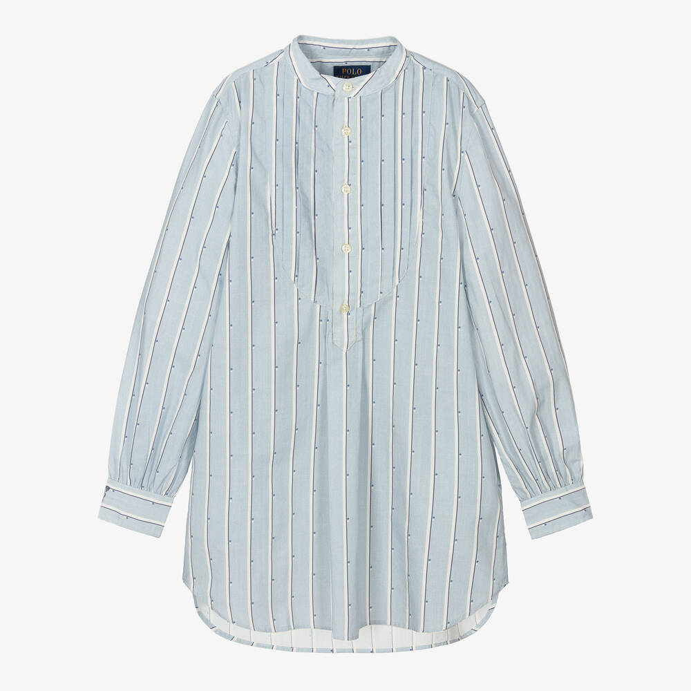 A lovely blue and white cotton shirt dress for girls by Ralph Lauren, patterned with subtle herringbone stripes and little diamond motifs. Soft and lightweight, this collarless dress is designed in a relaxed fit, with a bib-style front, a short button placket, a curved hemline and side seam pockets. The American brand's monogram logo embroidery on one of the long-sleeved cuffs for an added signature look.