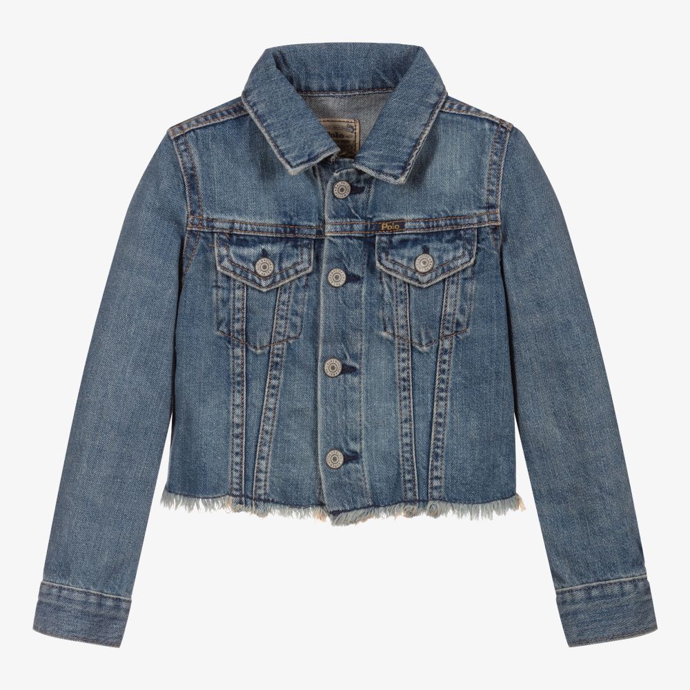 Blue denim jacket for girls, by Polo Ralph Lauren. Made from soft cotton denim, it has classic two pocket styling with contrast yellow stitching, a colourful Polo logo print on the back, and a cool frayed hem.