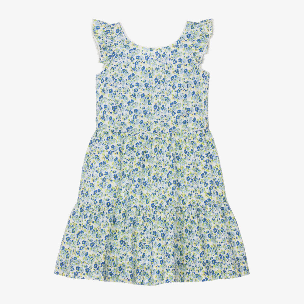 A lovely white cotton dress for girls by Ralph Lauren, patterned with charming blue, green and yellow flowers. The lightweight seersucker fabric has a soft, puckered texture and the neckline and sleeves are delicately trimmed with cotton lace. The bodice is partly lined and the tiered skirt has a flared, ruffled hem. It fastens neatly on the back with pearlescent buttons.