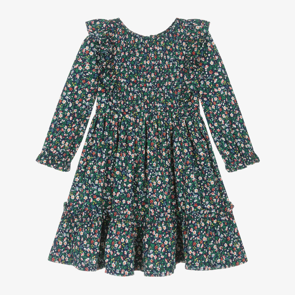 Girls navy blue, pink and green cotton dress by Ralph Lauren, with a pretty floral print. Made in comfortable, lightweight jersey, it has sweet ruffle trims over the shoulders, a ruched bodice and gently elasticated, frilled cuffs. It fastens with a stylish keyhole button on the back.