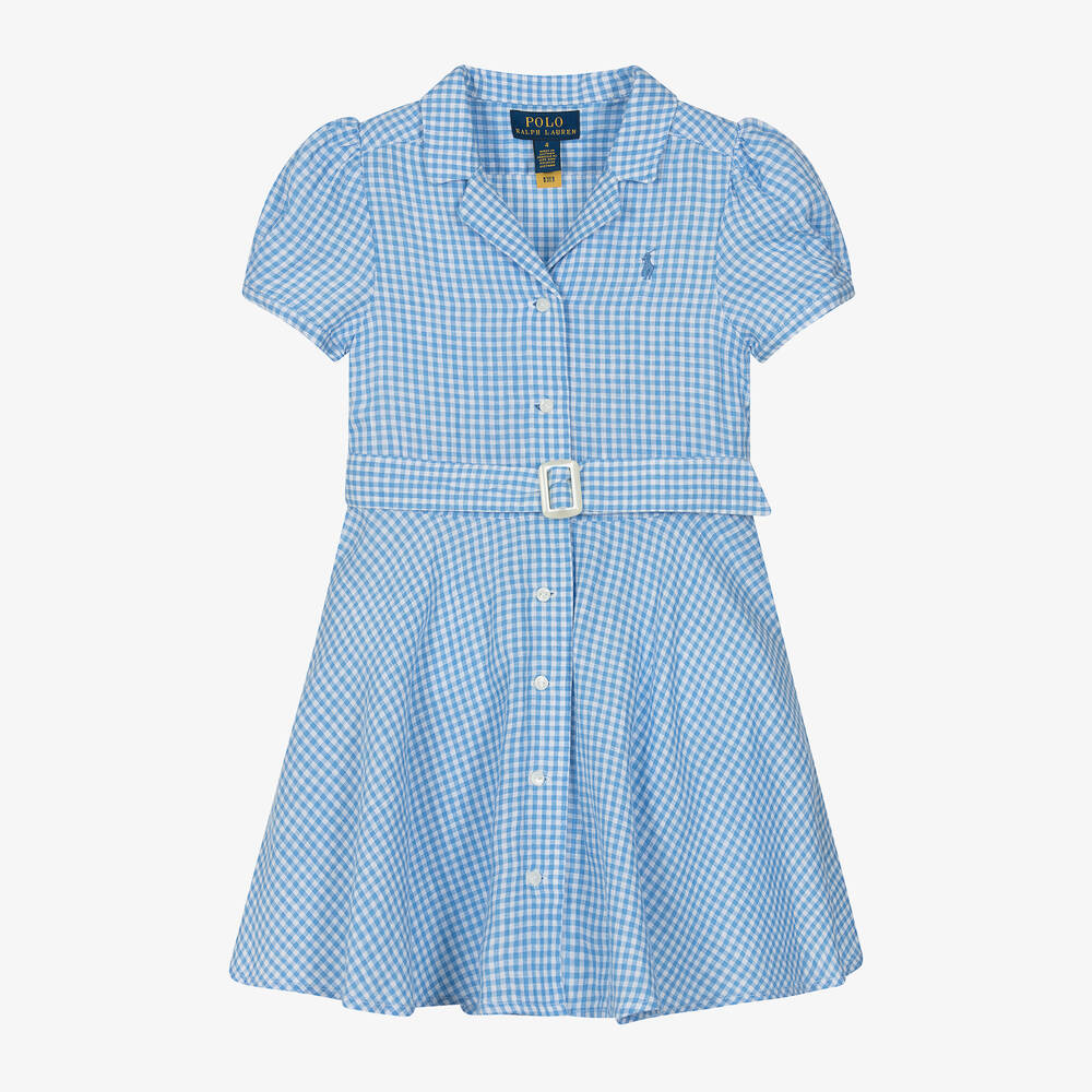 A charming style for warmer days, a blue and white gingham check shirt dress for girls from Ralph Lauren. Woven in soft and breathable linen, this fit and flare style has a revere collar, pretty puffed sleeves and button fastenings through the front. It comes with a matching belt to define the waist and there are useful concealed side seam pockets. The signature pony logo is embroidered on the chest for a distinctive yet discreet branded finish.