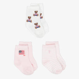 Pack of three pairs of ankle socks for girls by Ralph Lauren, knitted in a soft cotton-rich blend. Fun and stylish this set includes a navy blue pair featuring the brand's iconic Polo Bear, a grey pair with a classic blue and burgundy red argyle pattern and a signature embroidered Pony logo in gold. The third pair are beige with a fun animal print design and a purple embroidered Pony logo.