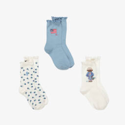 Girls Blue, Grey & Beige Cotton Knit Socks (3 Pack)
