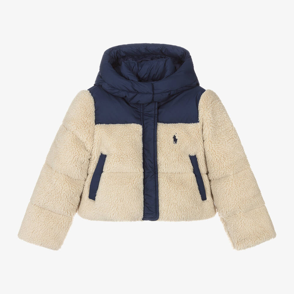 Girls ivory teddy fleece jacket by Ralph Lauren, designed with smooth, recycled navy blue trims. Padded in soft down for warmth, this cosy jacket is styled in a boxy fit with a statement logo appliqué on the back. It has useful zipped pockets, a detachable hood for alternative styling and concealed zip and popper fastenings on the front.