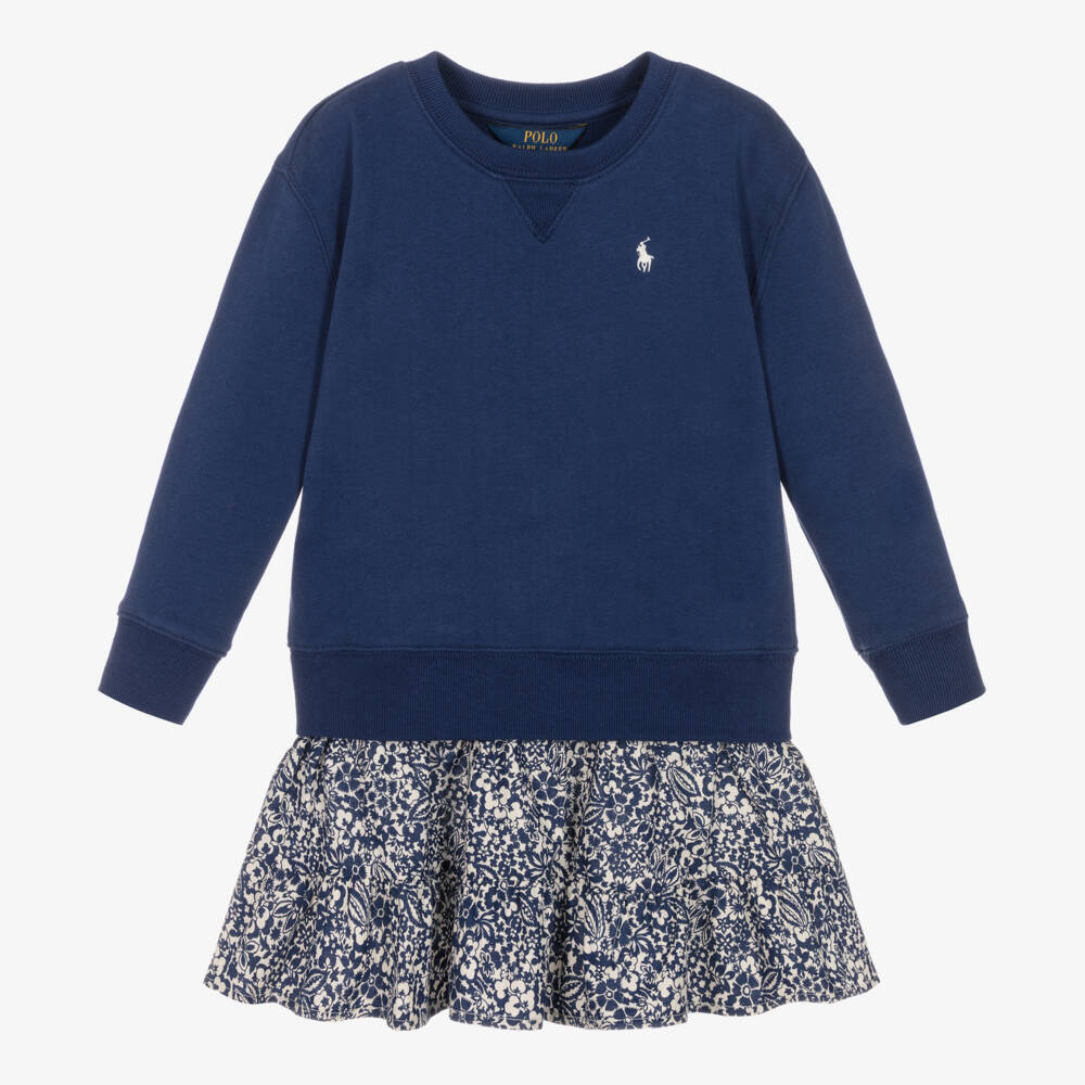 Comfortable navy blue dress for girls by Ralph Lauren. The sweatshirt bodice is made in a super soft jersey, with a warm fleecy inside. The tiered skirt is woven in soft cotton and has a pretty floral print in navy blue and white. The brand's small pony logo is embroidered on the chest in white.