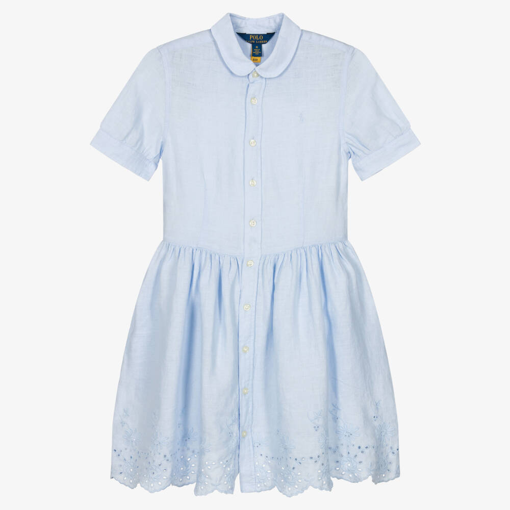 From American brand Ralph Lauren, blue dress for teen girls with a tonal pony logo embroidered on the chest for a subtle designer touch. The hem is decorated with beautiful broderie anglaise and scalloped edges for a feminine look. Ideal for warmer days, it is made in lightweight breathable linen and has structured short sleeves. The round collar and button fastenings on the front give a timelessly stylish, yet traditional finish.