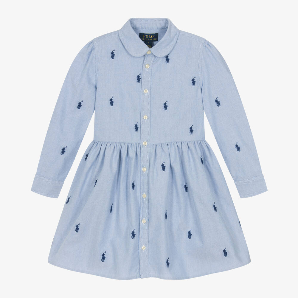 Pale blue Oxford cotton shirt dress for girls by Ralph Lauren, patterned with the brand's signature pony logo in navy blue embroidery. Fastening with buttons, this smart design has puffed long sleeves, a gathered waist and a lovely, full skirt with useful pockets concealed in the side seams.