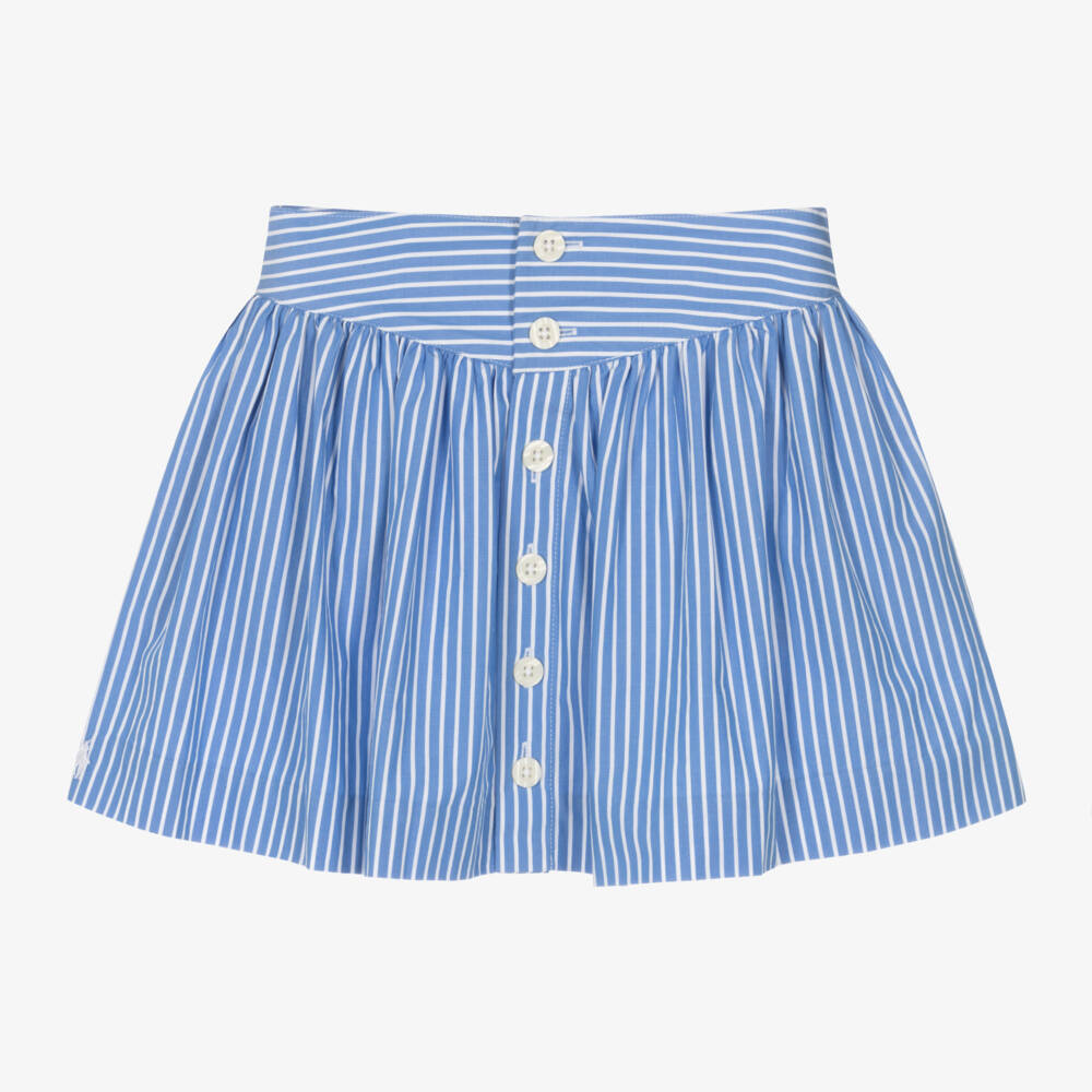 Casual blue and white striped skirt for girls by Ralph Lauren. Ideal for warm days, it is made in soft cotton poplin with a deep, shaped waistline and gathers for a full shape. Fastening with buttons on the front, it has an adjustable waist for a comfortable fit and practical concealed side pockets.