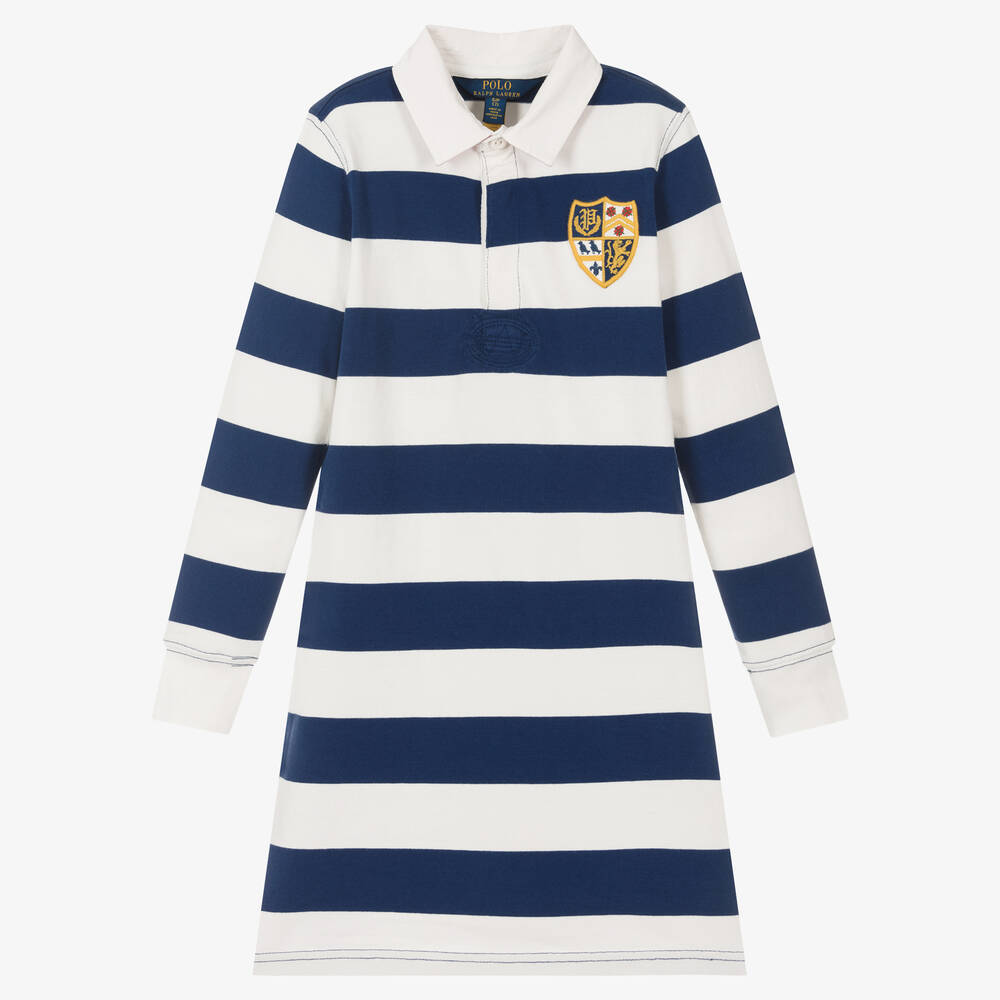 Blue and white cotton rugby shirt-style dress for girls by American brand Polo Ralph Lauren, with an embroidered crest logo badge on the chest. Ideal for relaxed, all-day wear, it is made in comfortable jersey with ribbed cuffs to keep wrists warm. The twill collar is lined in pink and there are button fastenings on the covered placket.