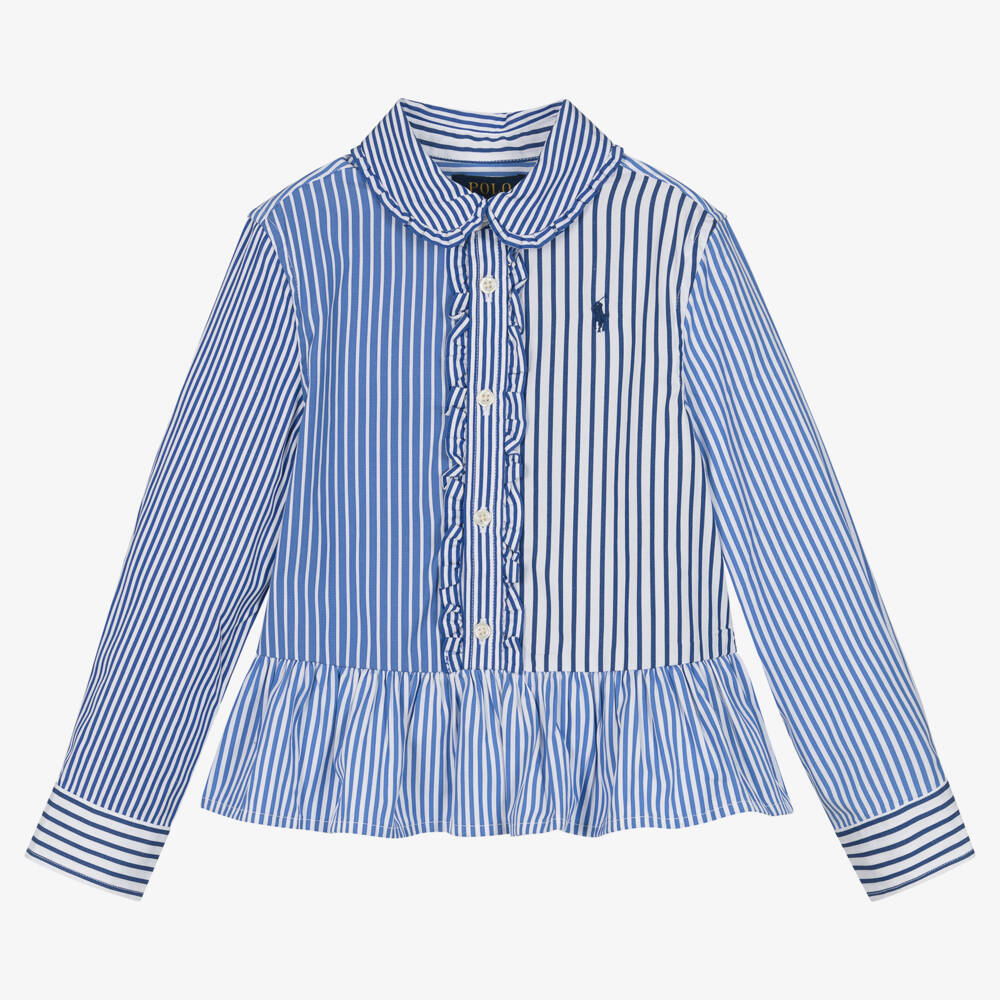 Blue and white striped shirt for girls by Ralph Lauren, made in smooth cotton poplin. Fun and feminine, it has pretty ruffle trims and a peplum hem. It fastens with buttons down the front and has the brand's signature pony logo embroidered on the chest in navy blue.