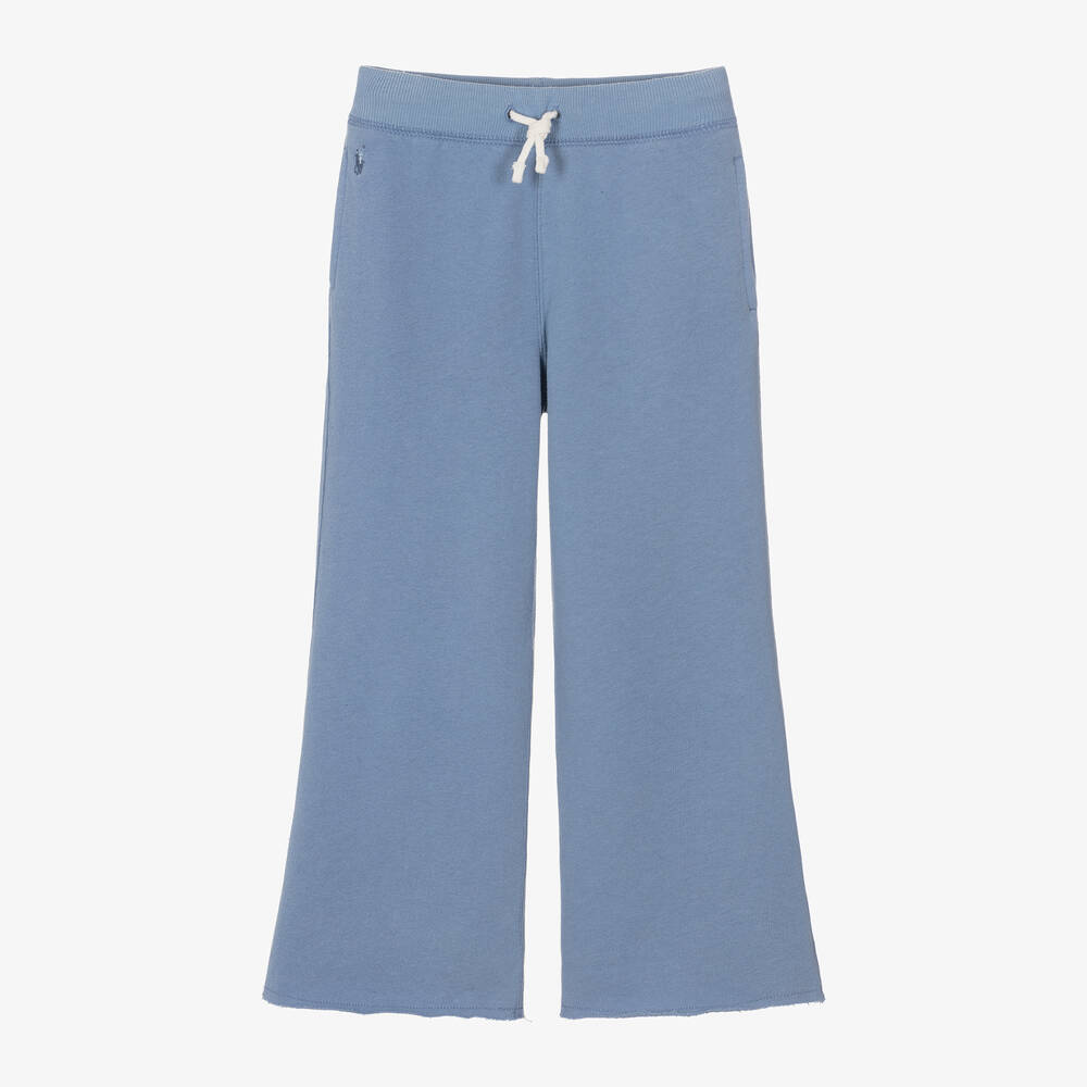 Comfortable blue joggers for girls by Ralph Lauren, in a stylish wide leg fit with raw edge hems. They are made in super soft, mid-weight cotton jersey with a cosy brushed feel inside. The stretchy, ribbed waistband has an adjustable drawstring for a great fit and the practical pockets are concealed in the side seams. Completing the look, the American brand's signature Pony logo is embroidered on one side in tonal thread.