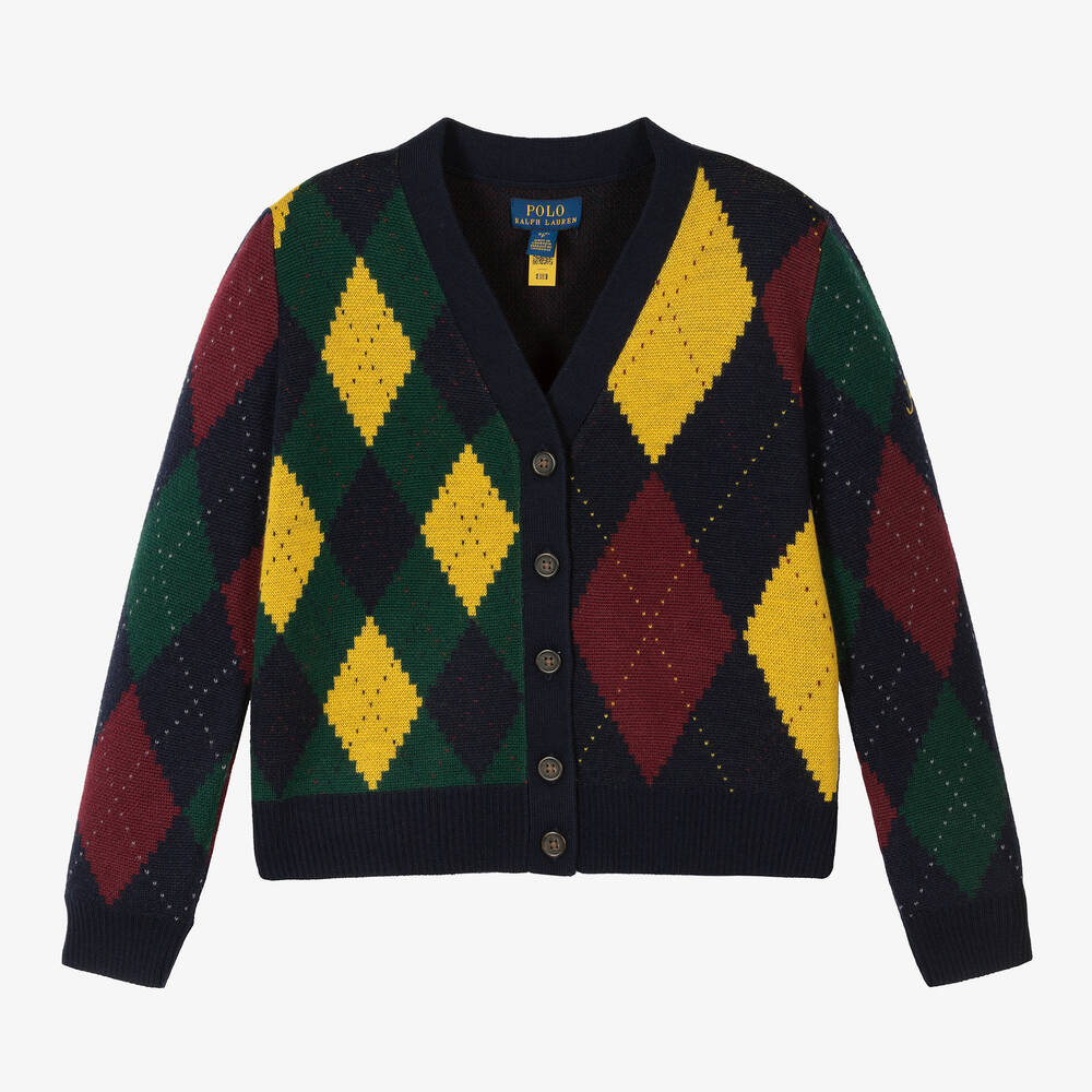 Navy blue v-neck cardigan for girls by American brand Ralph Lauren, made in a beautifully soft wool knit. In rich tones of green, yellow and burgundy red, this argyle patterned cardigan has cosy ribbed trims and fastens neatly on the front with buttons. The brand's Polo logo script is embroidered on one arm in yellow, for a signature designer finish
