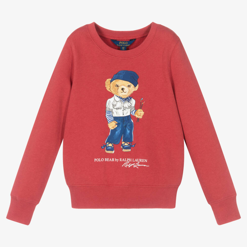 Dark red sweatshirt for older girls by Polo Ralph Lauren, made in luxuriously soft cotton jersey with a fleecy inside. A versatile piece, it features the signature Polo Bear on the front, holding her paintbrushes. It is designed with ribbed-knit trims for a warm and cosy feel.