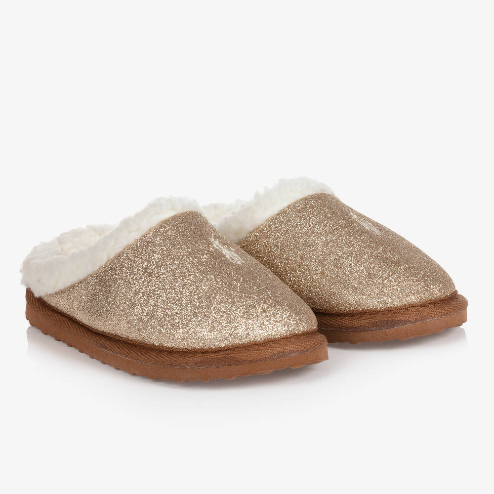 Luxury gold slippers for girls by Polo Ralph Lauren, with a gorgeous glittery finish. Ideal for lounging, these lovely slip-ons have a faux shearling lining and trim to keep little feet warm and cosy. Comfortable with a padded insole, they have a non-slip outer sole and the signature pony logo embroidered on the front for instant brand recognition.