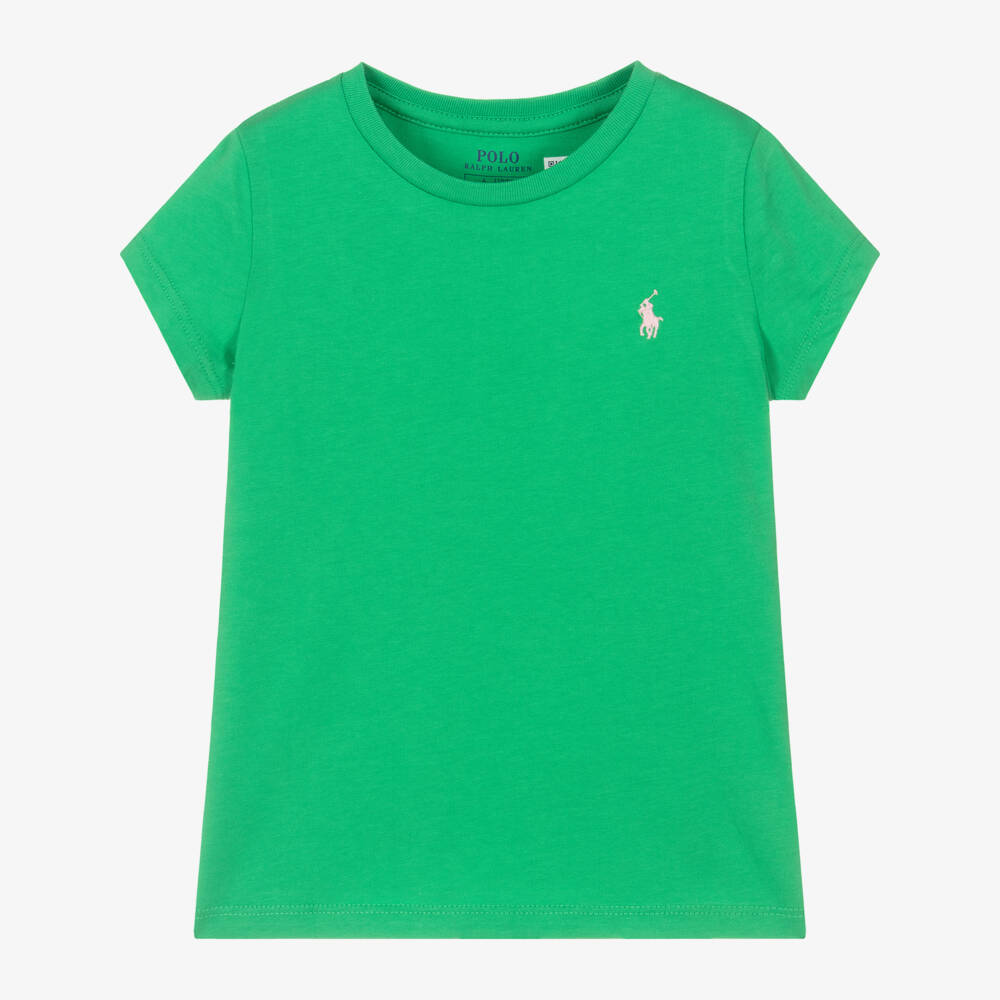 A green T-shirt for girls by Ralph Lauren, made in soft cotton jersey. Great for everyday casual wear, it is styled with short sleeves and a lightly ribbed crew neck. The brand's signature pony logo is embroidered on the chest in pale pink for designer appeal.
