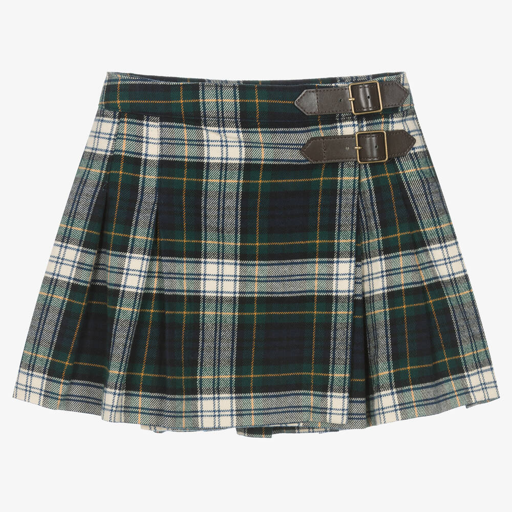 A lovely green and ivory tartan check skirt for girls by Ralph Lauren, made in softly brushed cotton twill. A wrap style, it has crisp knife pleats and is trimmed with faux leather buckles. It has an adjustable waist for an ideal fit, with a hook and eye fastening.