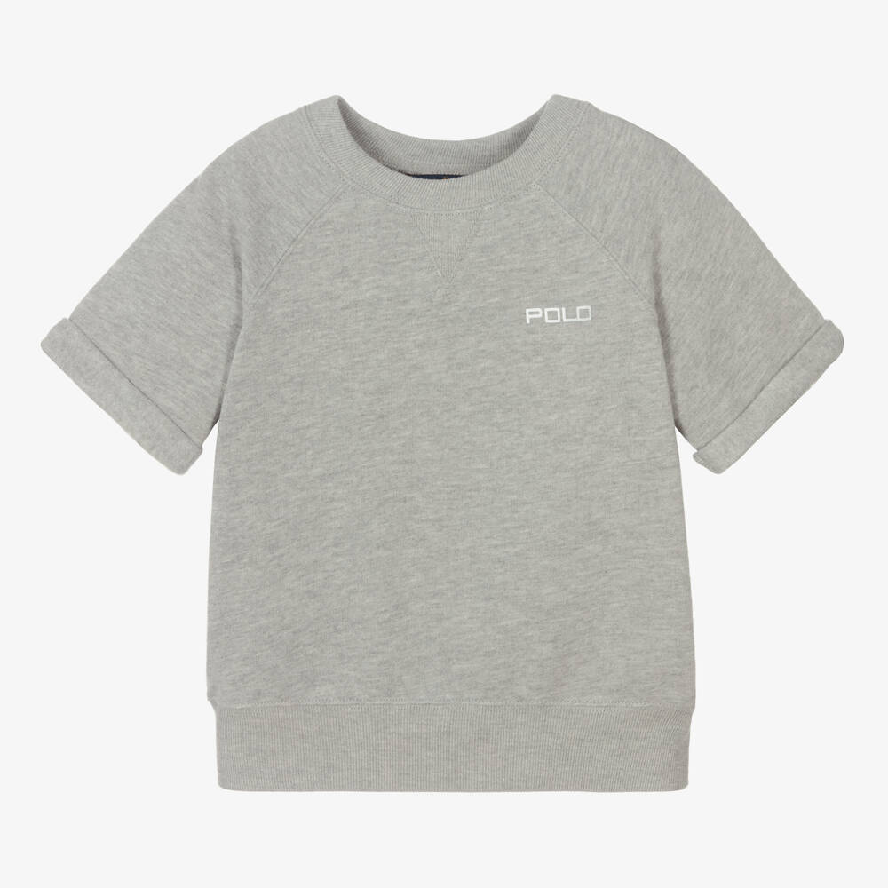 Girls grey marl jersey fleece sweatshirt by Polo Ralph Lauren. Designed in a wide, boxy shape, there are elbow-length turned-up sleeves, ribbed cuffs and hem, and a crew neckline. There is a soft, fleecy underside and the designer's logo is printed on the chest in reflective silver.