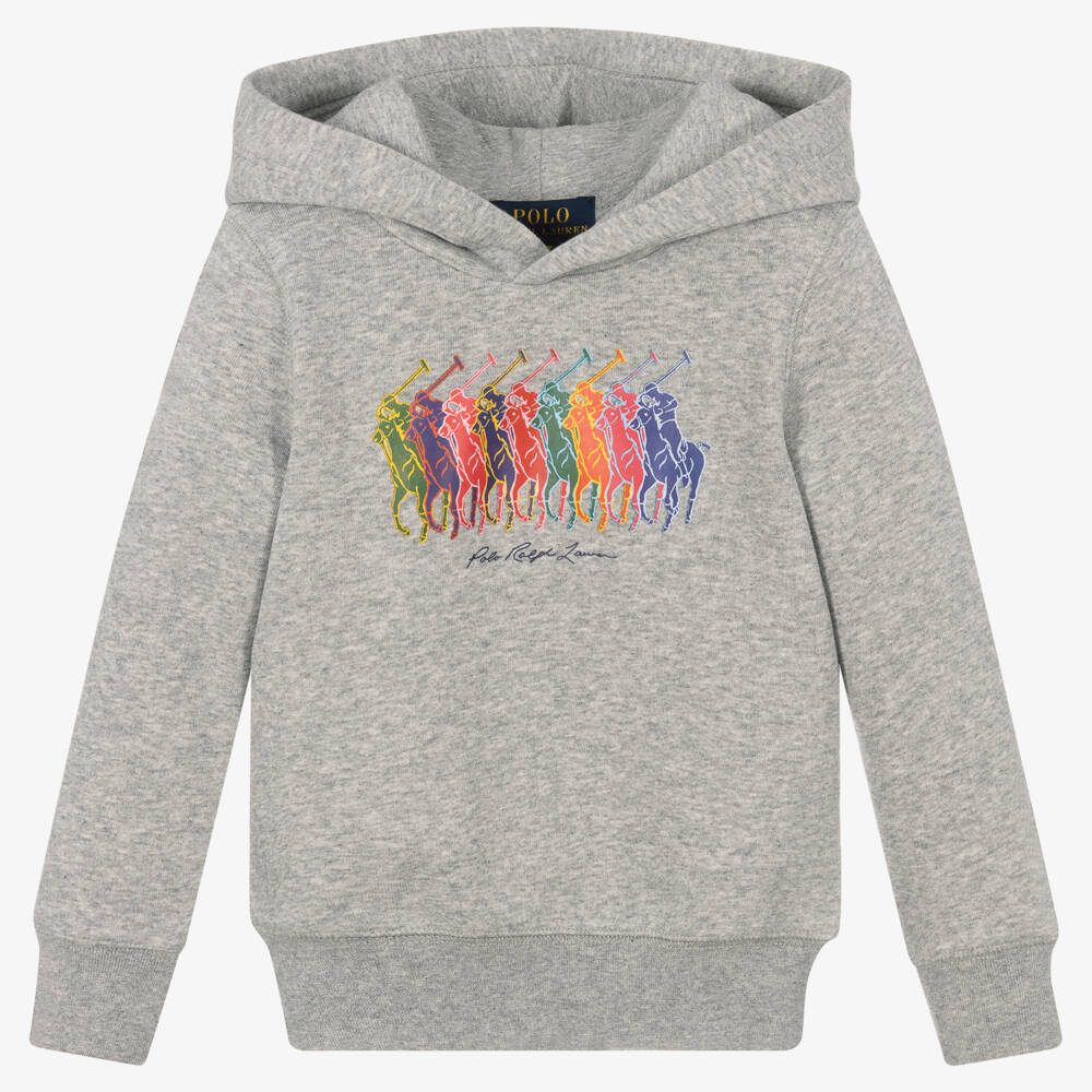 Grey marl cotton hoodie for girls by American brand Polo Ralph Lauren. Just right for casual wear, it is made in comfortable jersey with a warm, fleecy inside. The designer's colourful repeat iconic Big Pony is printed on the front, with a black logo below.