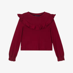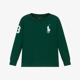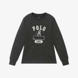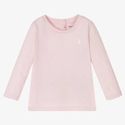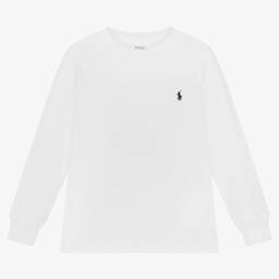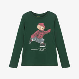 Ivory long-sleeved top for girls by Ralph Lauren, made in soft cotton jersey. This casual tee features the iconic Polo Bear on the front, looking very smart in a preppy outfit.