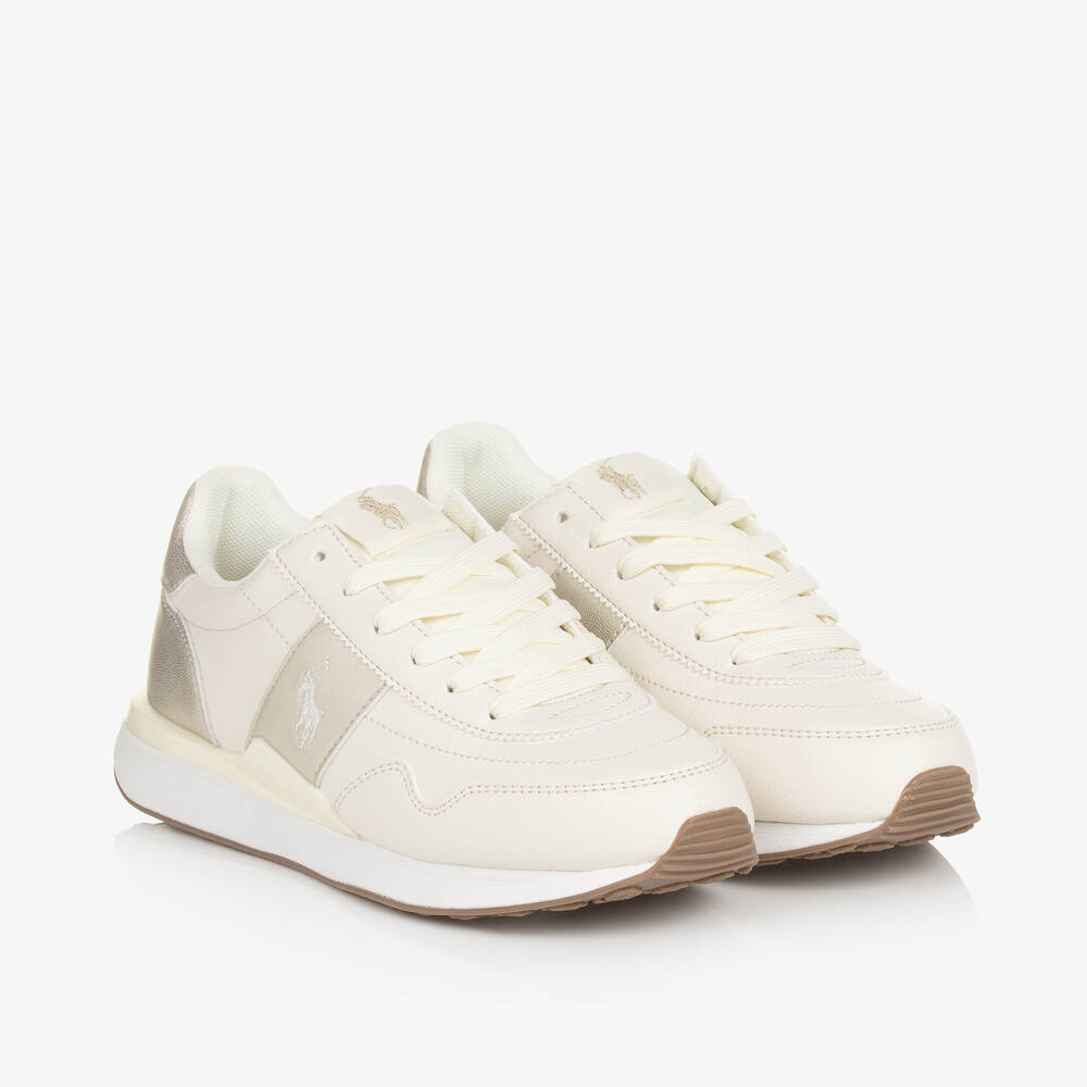 Stylish ivory trainers for girls by American brand Ralph Lauren, with shiny, pale gold trims and glossy ivory detailing. Made in supple faux leather, they are easy to put on, with a velcro strap and elasticated laces. Both comfortable and breathable, they have a padded insole and lining made in soft textile. The white, outer sole is non-slip for safety. For an instantly recognisable look, the signature pony logo is embroidered on the sides and tongue, with a further logo on the heel.
